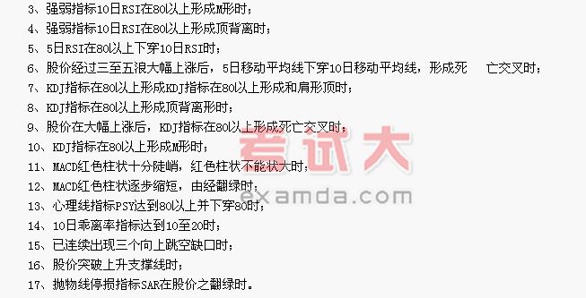 2、当股价连续上涨,或经过数浪上涨后,形态上出现M形、头肩顶形、菱形、喇 叭形、倒V字形、圆弧顶形形态时;