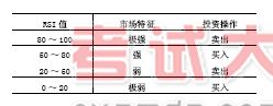 ,短期RSI>长期RSI,则属多头市场; 第二,短期RSI<长期RSI,则属空头市场。 当然,这两条只是参考,不能完全照此操作。 ②根据RSI 取值的大小判断行情 将100 分成四个区域,根据RSI 的取值落入的区域进行操作。划分区域 的方法如下:
