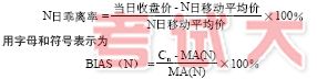 式中,分子为股价(收盘价)与移动平均的距离,可正可负,除以 分母后,就是相对距离。 BIAS 的公式中含有参数的项只有一个,即MA。这样,MA 的参数就是BIAS 的参数,即乖离率的参数就是移动平均价的参数,也就是天数。参数大小的 选择首先影响MA,其次影响BIAS。一般说来,参数选得越大,则允许股价远 离MA 的程度就越大。换句话说,股价远离MA 到了一定程度,我们就会认为 股价该回头了,而这个远离的程度是随着参数的变大而变大的。例如,参数 为5 时,我们可能认为BIAS 到了4%,股价就该回头了;而参数为10 时, 我们则必须等到BIAS 超过4%,比方说到了7%才认为股价该回头。