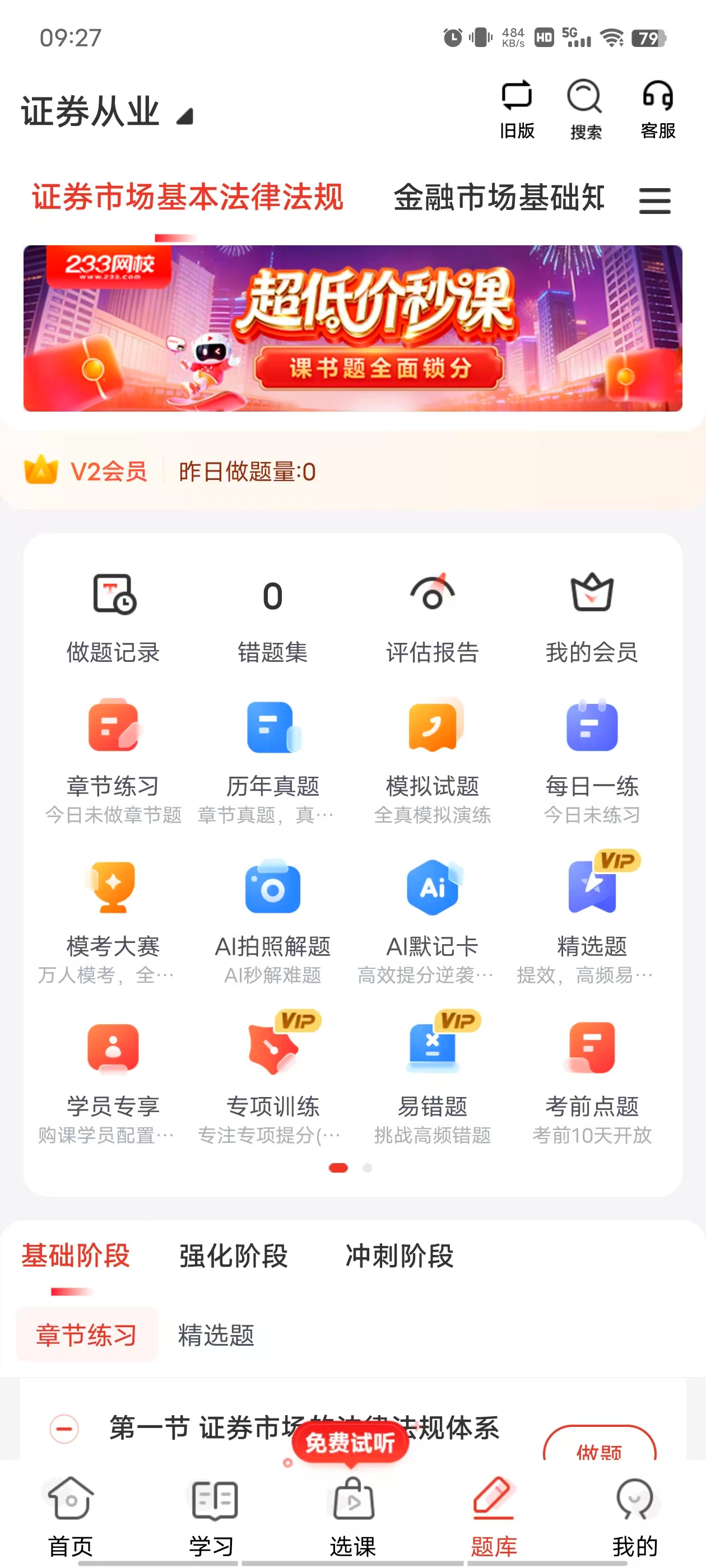 1、题库资源丰富:233网校APP的证券从业题库包含金融基础知识、证券法律法规、证券投资顾问、证券分析师、保荐代表人等五科,题量充足,涵盖章节练习、模拟试题、历年真题、每日一练、考前点题等常用版块。题库试题由233网校教研团队研发制作,质量高且更新及时,能够满足考生不同阶段的备考需求。