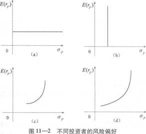 无差异曲线为水平线,表示风险中性者,对投资风险的大小毫不在意,他们只关心期望收益率的大小。无差异曲线为垂直线,表示投资者只关心风险,风险越小越好,对期望收益率毫不在意,是完全保守的投资者。对风险厌恶者而言,风险越大,对风险的补偿要求越高,因此,无差异曲线表现为一条向右凸的曲线。曲线越陡,投资者对风险增加要求的收益补偿越高,投资者对风险的厌恶程度越强烈;曲线越平坦,投资者的风险厌恶程度越弱。