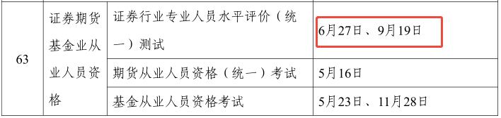 | 证券从业资格考试 | 统一测试 | 2026年6月27、28日 | 北京、天津、石家庄、太原、呼和浩特、沈阳、长春、哈尔滨、上海、南京、杭州、合肥、福州、南昌、济南、郑州、武汉、长沙、广州、南宁、海口、重庆、成都、贵阳、昆明、拉萨、西安、兰州、西宁、银川、乌鲁木齐、大连、青岛、宁波、厦门、深圳、苏州、温州、泉州、赣州、珠海41个城市。 |