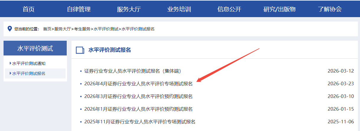 第一步:登录【中国证券业协会网站】→【从业人员】→【水平评价测试平台】→【水平评价测试报名】栏目,在该页面找到并点击进入对应考试的报名入口即可。
