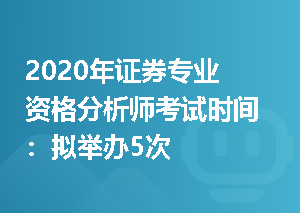 根据中国证券业协会网站发布的2020年证券业从业人员资格考试,发布证券研究报告业务(证券分析师胜任能力考试)拟举办5次考试,考试时间分别在3月、5月、7月、8月、11月举行。5次考试时间安排如下: 考试次数 考试时间 第一次3月28、29日第二次5月30、31日第三次7月11、12日第四次8月29、30日第五次11月28、29日证券分析师胜任能力考试考试属于证券专项业务类资格考试的一类,考试科目名称为《发布证券研究报告业务》。 证券分析师胜任能力考试范围参考《证券分析师胜任能力考试大纲(查看更多>