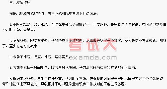 1.全面系统学习。学员对于参加考试的课程,必须全面系统地学习。对于课程的所有要点,必须全面掌握。很难说什么是重点,什么不是重点。从一些重要的历史性的时间、地点、人物,到证券价值的决定、证券投资组合的模型,再到最新的政策法规的等等,都是考试的范围。全面学习并掌握了考试课程,应付考试可以说是游刃有余,胸有成竹。任何投机取巧的方法,猜题、的方法,对付这样的考试,只能适得其反。