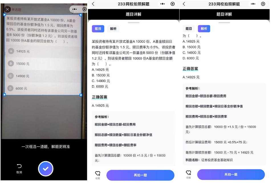 这是最懂证券考生的 “解题神器”!面对各种难题,无需手动输入题干,打开小程序对准题目轻轻一拍,AI 精准识别题干、选项甚至图表,3 秒内生成完整解析:不仅给出标准答案,还会标注 “考查核心考点”,更拆解解题思路(先判断考点→再对应法条 / 公式→最后排除干扰项),帮你不仅知其然,更知其所以然。通勤时遇到错题、午休时碰到难题、睡前复盘卡壳题,随时随地拍一拍,难题不隔夜,备考不卡壳。