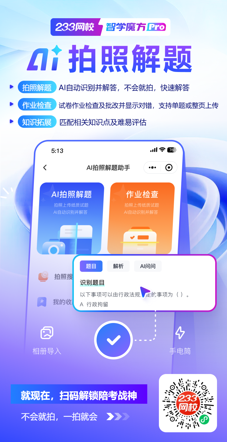 证券备考,不怕题难,就怕卡壳耗时间。这款 AI 拍照解题小程序,把 “查答案、找考点、学思路” 三步合一,让你遇到难题不用慌,一拍就能解,解完还能学,再也不用被卡壳题打乱备考节奏!扫码下图二维码即可快速体验233网校的AI拍照解题功能,快去试试吧。