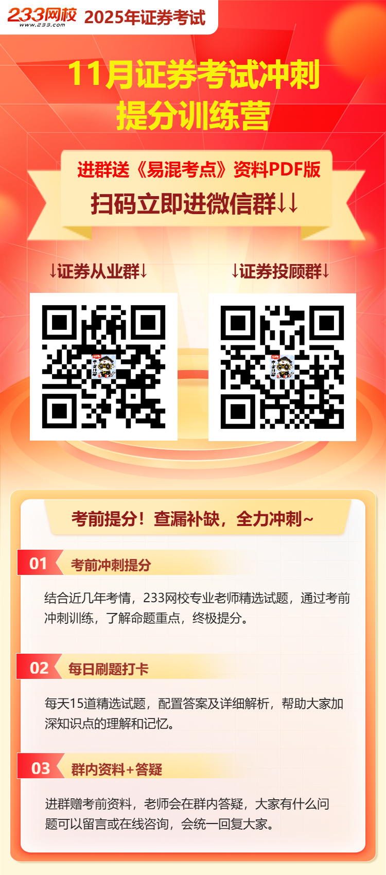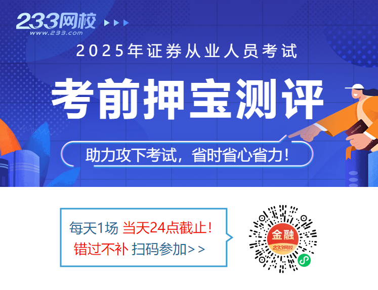 2025年11月证券从业人员考试进入倒计时,你还在盲目题海战术?临考冲刺,拒绝无用功!233网校证券考前【冲刺提分】训练营来啦!233网校老师通过历年真题大数据分析,挑选了部分常考点考题供大家考前冲刺抢分,报名送易混考点+易错题资料,如果遇到不懂的,还可以群内跟老师咨询解惑,让你冲刺刷题不迷茫!