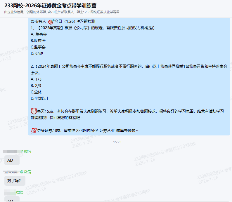 ✅每日下午3点,专属习题检测准时上线,群内开启答案接龙模式。习题精准对应上午带学的考点,针对性强化巩固,让你立刻知晓自己的掌握程度;接龙互动还能结识同期考友,互相监督、互相鼓励,告别独自备考的孤单与懈怠,备考氛围直接拉满。