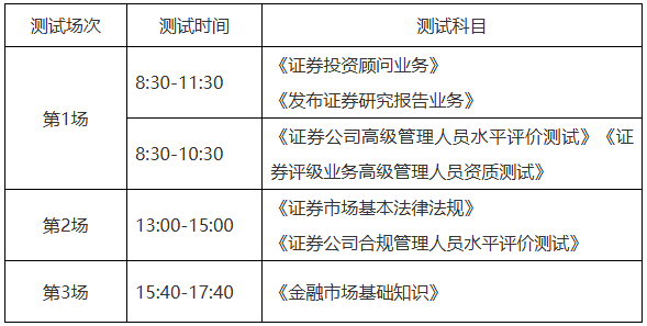 2025年8月证券行业水平专场测试准考证打印几点截止?8月16日18时截止。本次预约测试一共安排了3个场次考试,时间分别是8:30-11:30(10:30),13:00-15:00,15:40-17:40,具体各场次测试科目如下: